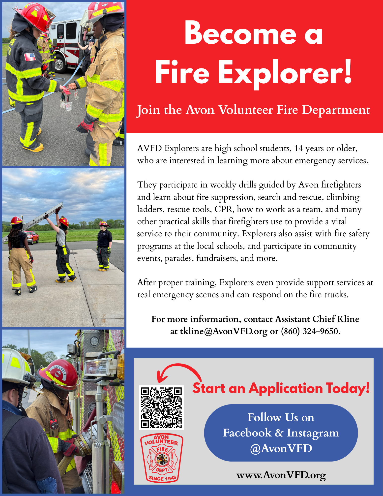 Over the past 80+ years, more than 750 Avon residents have donated their time to the Avon Volunteer Fire Department, and the Department is constantly looking for dedicated volunteers to help with fire fighting, rescue, and administration.